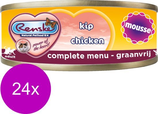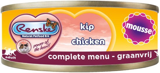 Renske Kattenvoer Mousse Kip is een smakelijke complete natvoeding voor katten. Door het hoge kip gehalte, is dit een zeer licht verteerbaar en smakelijke maaltijd. Deze maaltijd is geheel vrij van suikers, zout, chemische conserveringsmiddelen, kleur-, geur- en smaakstoffen.