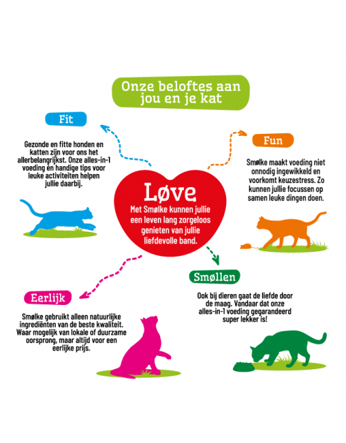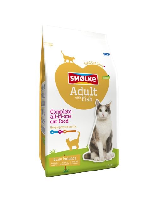 Smølke Adult with Fish and Rice is een volledige Alles-in-één kattenvoeding afgestemd op de behoefte van volwassen katten vanaf ongeveer 12 maanden. De voeding is samengesteld zonder tarwegluten en extra Omega-3 vetzuren uit duurzame vis en visolie ondersteunen een perfecte conditie van huid en vacht. Smølke Adult with Fish and Rice is gemaakt met natuurlijke ingrediënten en heeft een uniek eiwitprofiel bereid met maarliefst 19% duurzaam gevangen vis met het MSC keurmerk, Nederlandse kip en Brits lam. Smølke Adult with Fish and Rice is een gezonde en gebalanceerde voeding die iedere dag weer zorgt voor een blije en tevreden kat. Natuurlijk zonder kunstmatige geur-, kleur- en smaakstoffen en chemische antioxidanten!